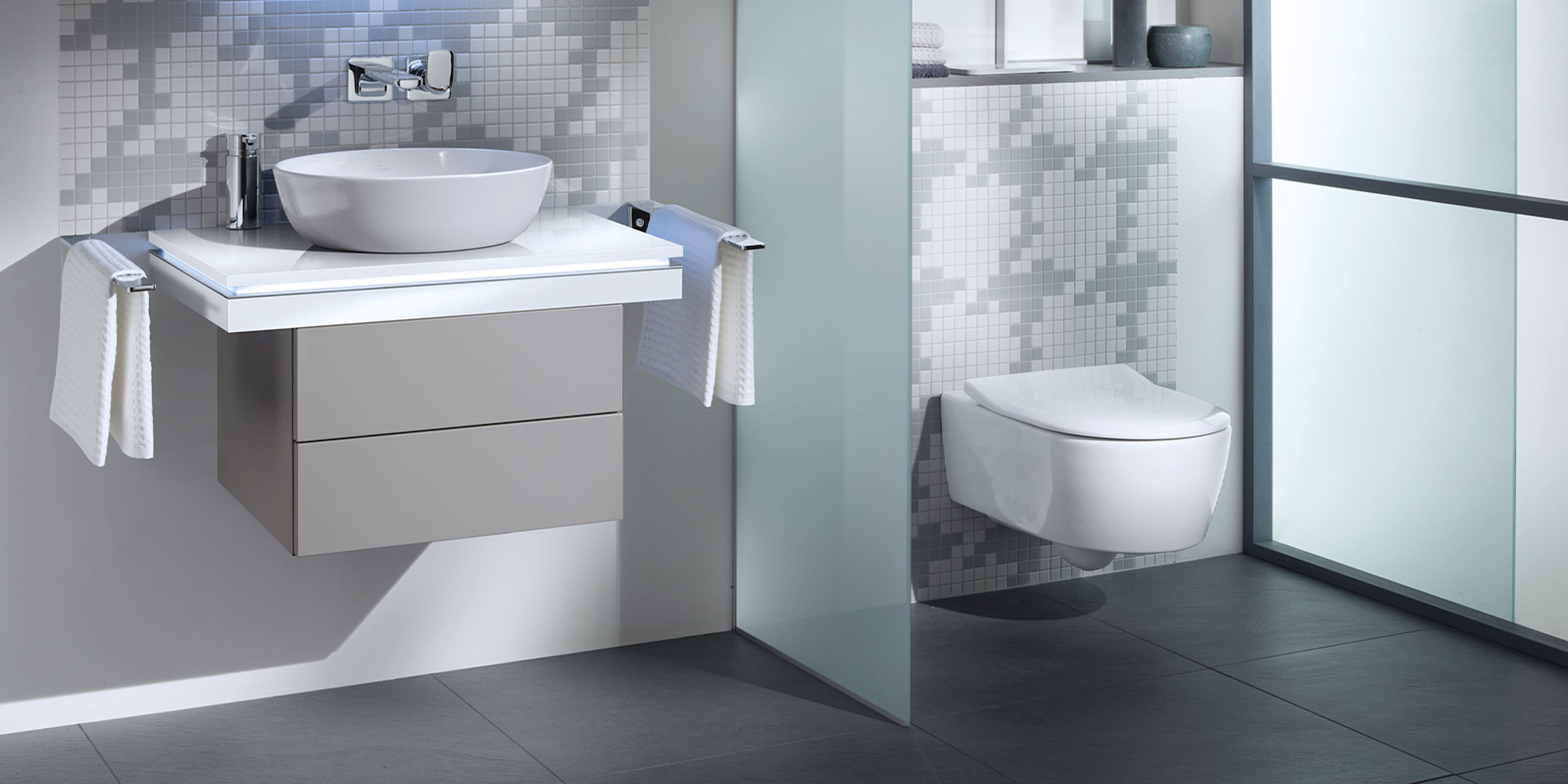 Das Komfort-Bad ist ein Bad der oberen Mittelklasse, das sich durch seine persönliche Note auszeichnet. In der Gestaltung werden Ihre Wünsche und Ihr persönlicher Stil verwirklicht. Von der Wellness-Duschlösung über die gehobene Badausstattung bis hin zur kreativen Fliesenplanung – alles ist möglich. Auch maßgefertigte Einbauten und Stauräume gehören zum Komfort-Konzept. Für ein Bad, das perfekt zu Ihnen und Ihren Ansprüchen passt.